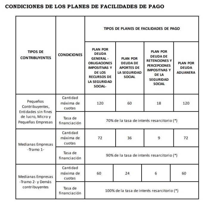 - Sujetos comprendidos: Podrán confección este plan de facilidades los pequeños contribuyentes (personas humanas y sucesiones indivisas), los caracterizados como Micro, Pequeñas y Medianas empresas (tramo I y II) con certificado PYME vigente, las entidades sin fines de lucro y demás contribuyentes no mencionados anteriormente.