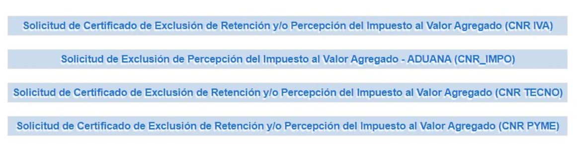 La tramitación del certificado se deberá realizar desde el servicio disponible en la página web de AFIP “Certificados de Exclusión de Retenciones y/o Percepciones del Impuesto al Valor Agregado”. En el caso de que el contribuyente afectado no sea importador ni una empresa del rubro de la economía del conocimiento se debe seleccionar la opción de “CNR IVA”. Al seleccionar la opción correspondiente, el mismo sistema detecta el cumplimiento o no de los requisitos preestablecidos y en caso de estar todo correcto otorgará un acuse de presentación.